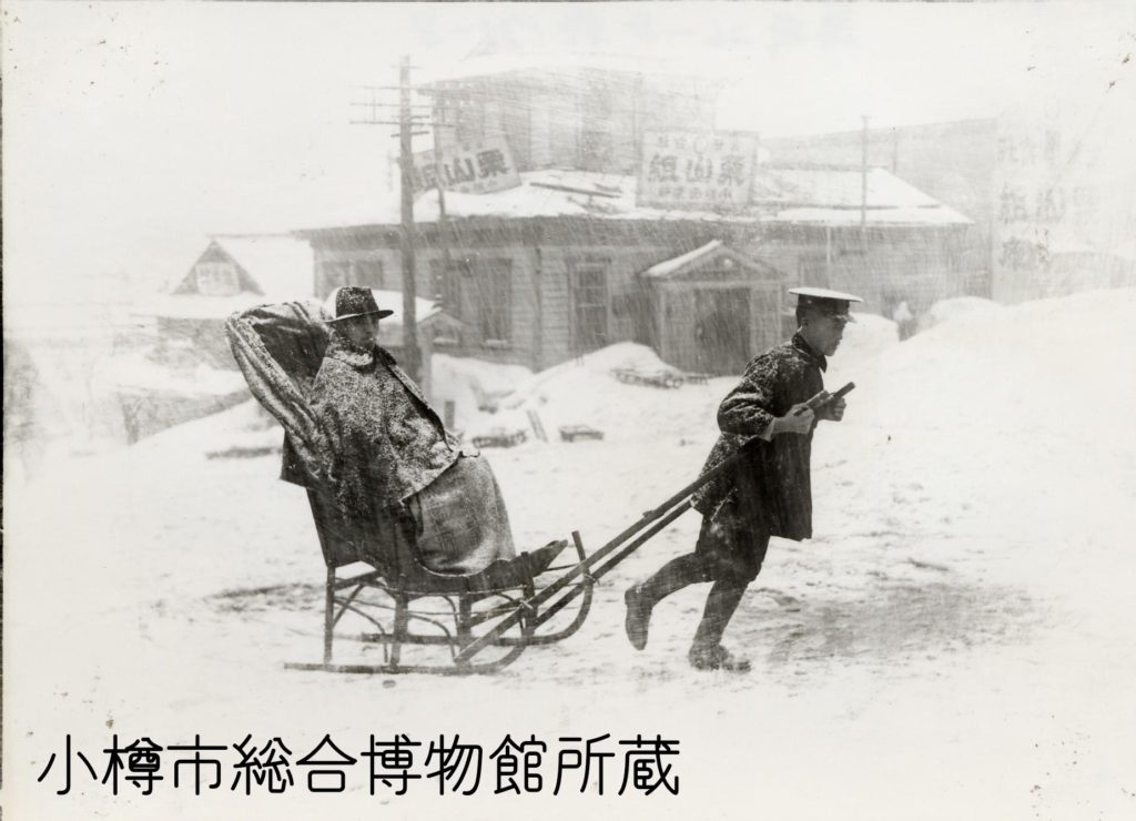 現在小樽では、夏期だけでなく積雪期でも人力車が走っていますが、戦前期は積雪期になると人力橇(じんりきそり)が使われていました。人力車の車輪が雪に埋まってしまうためです。