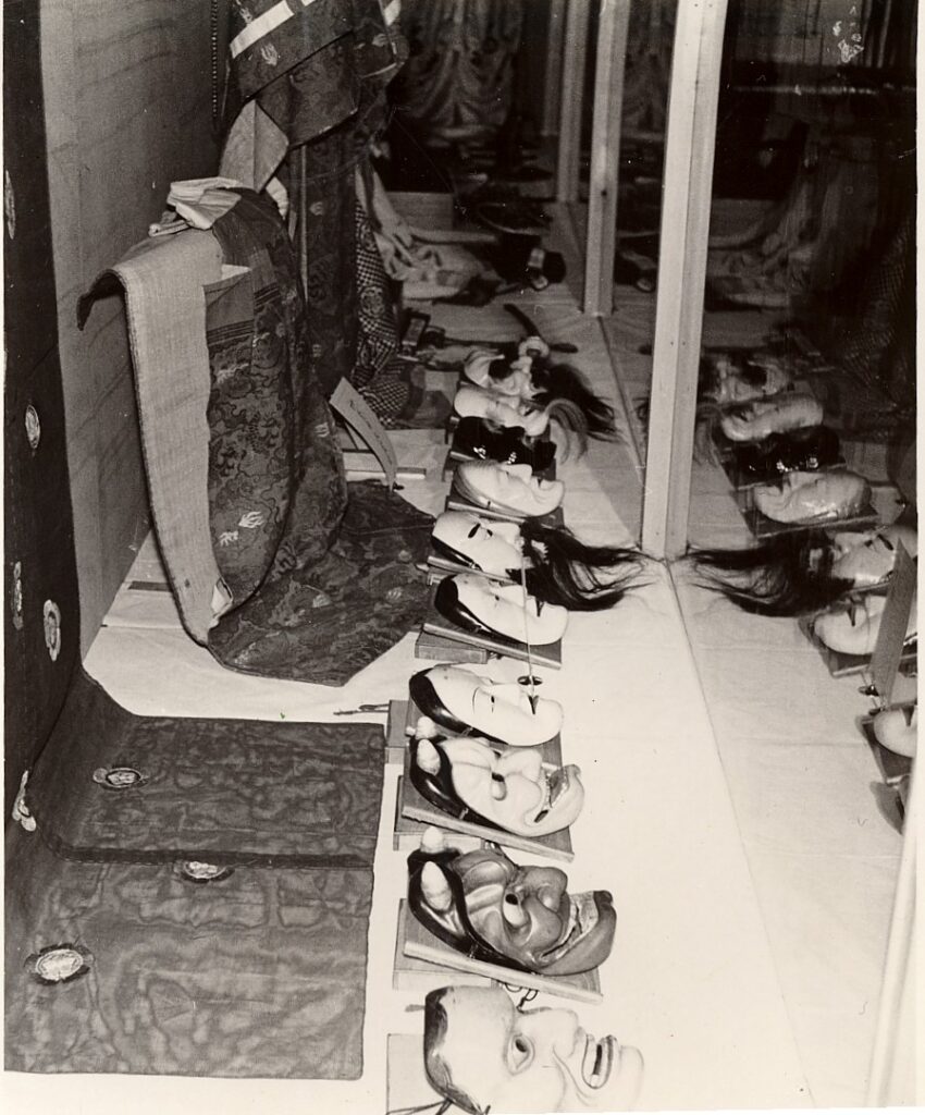 翌昭和32(1957)年にも「博物館開館一周年記念雅楽神楽装束、面展覧会」を開催しています。これについては写真がのこっており、2階会議室、当時の「歴史室」での展示で、住吉神社からの借用であったようです。